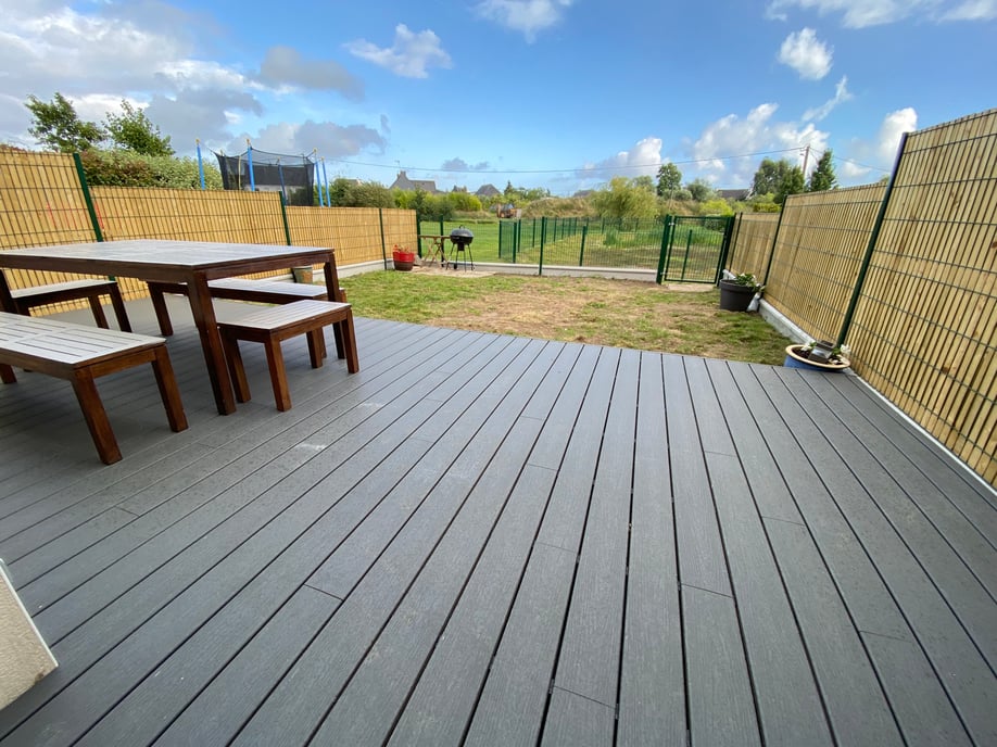 En composite avec petit coin d'herbe (en cours d'aménagement), entièrement clos.