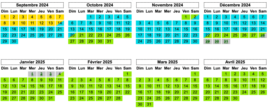 Période en cours de réservation attente de confirmation (zones grisées non barrées, dates jaunes sur fond gris)